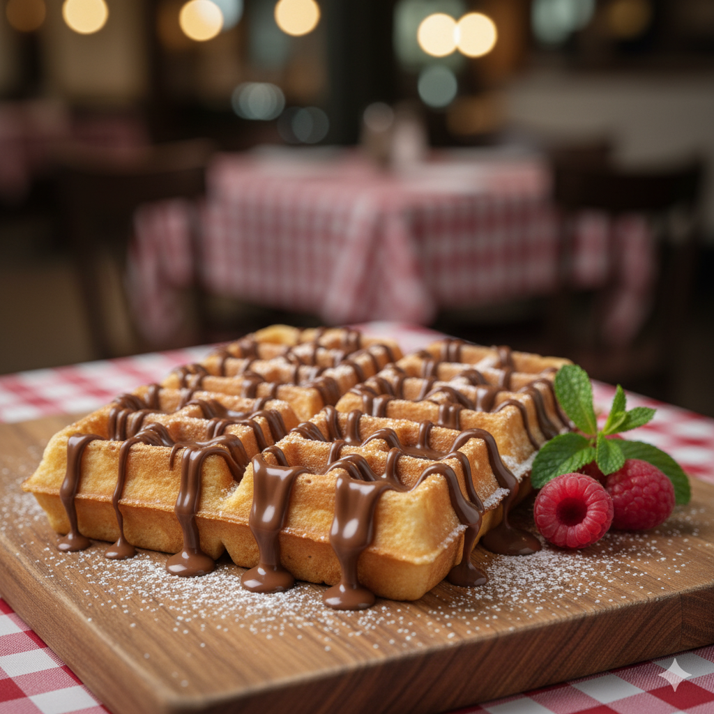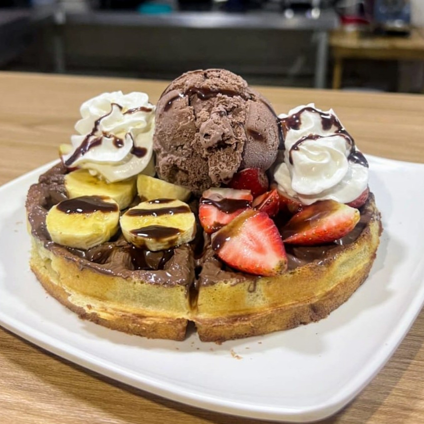 Waffle con Nutella, fresa, banano, 1 bola de helado a elección, cereza, chantilly, salsa de chocolate.