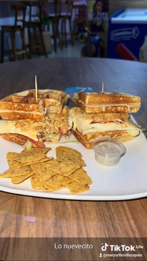 delicioso waffle que contiene lechuga, tomate, pollo, queso, salsa de la casa, acompañado de nachos