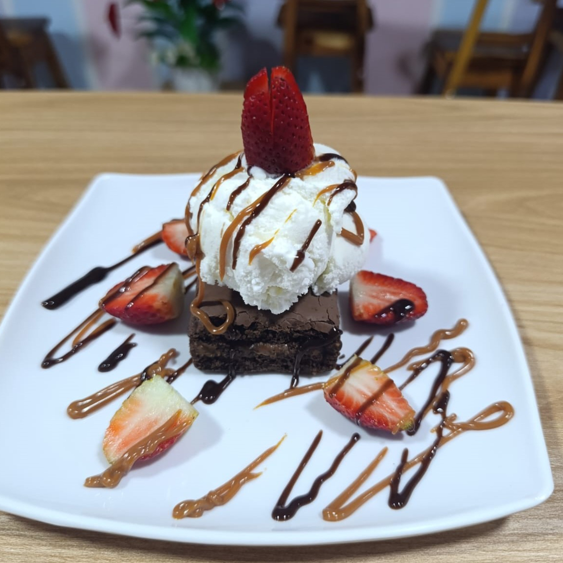 Brownie con 1 bola de helado a elección, chantilly, cereza, chocolate.