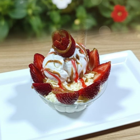 Fresas, crema de leche de la casa, queso, salsa de fresa, arequipe, 1 bola de helado a elección.