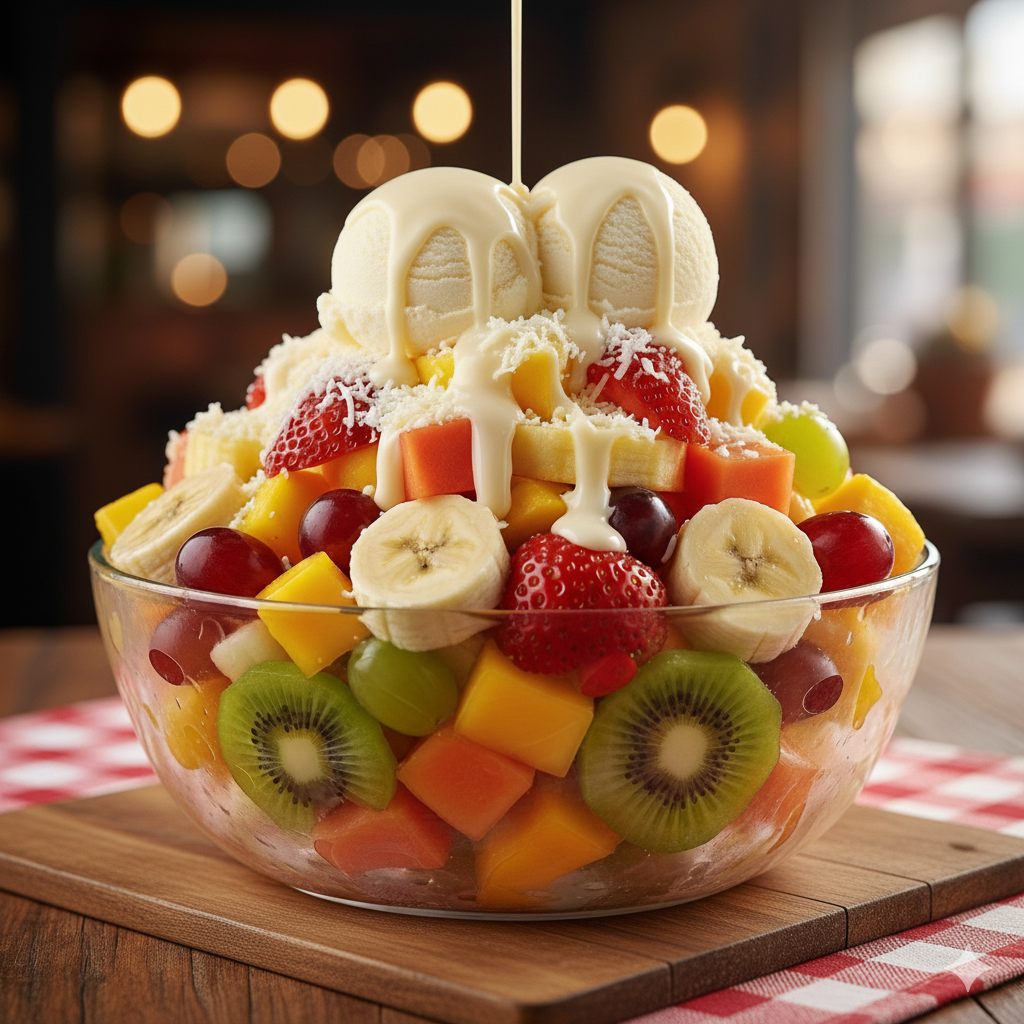 Acompañada de banano, fresa, mango, papaya, uva, kiwi, crema de leche, queso, lechera, 2 bolas de helado a elección.