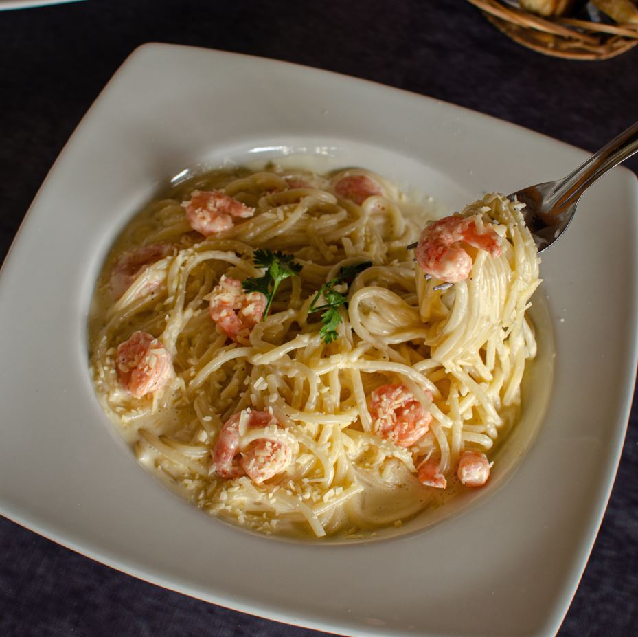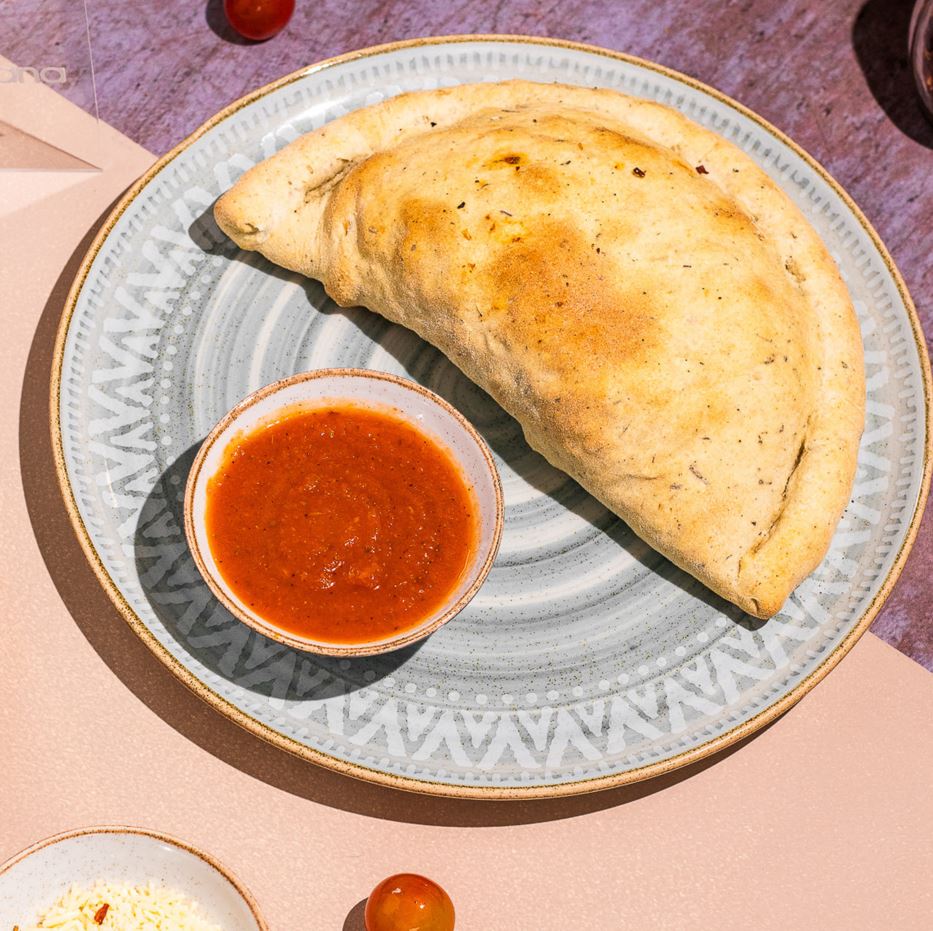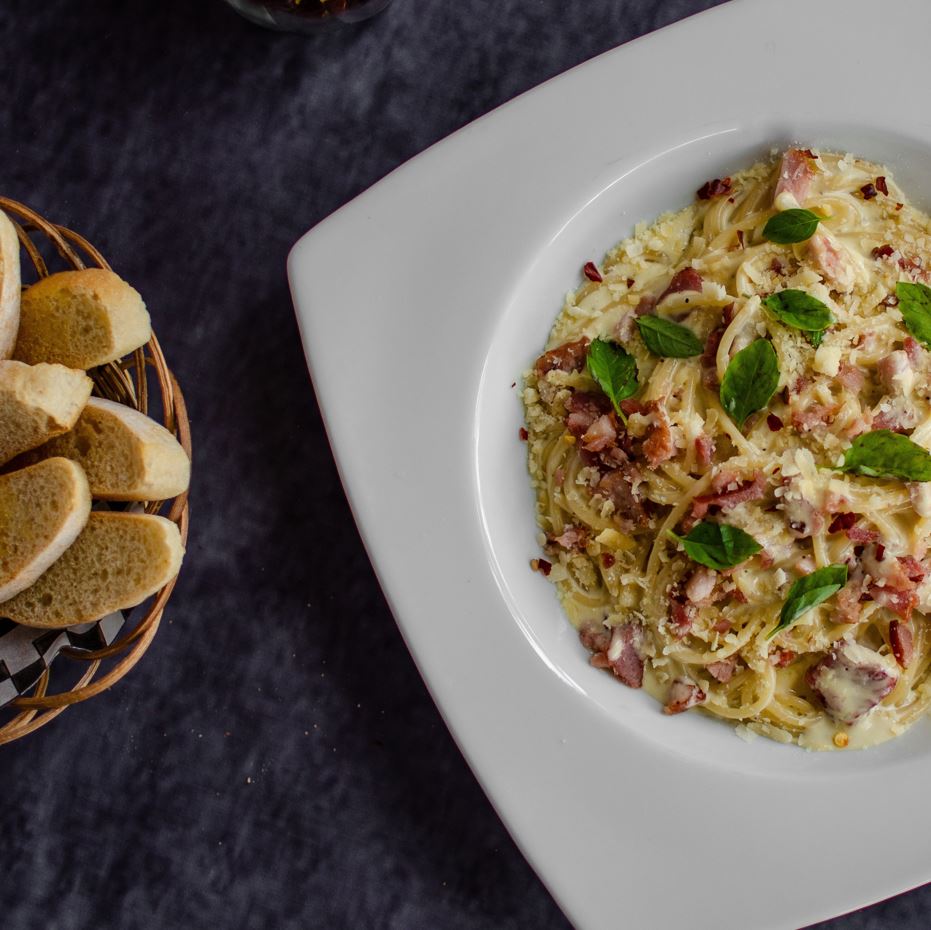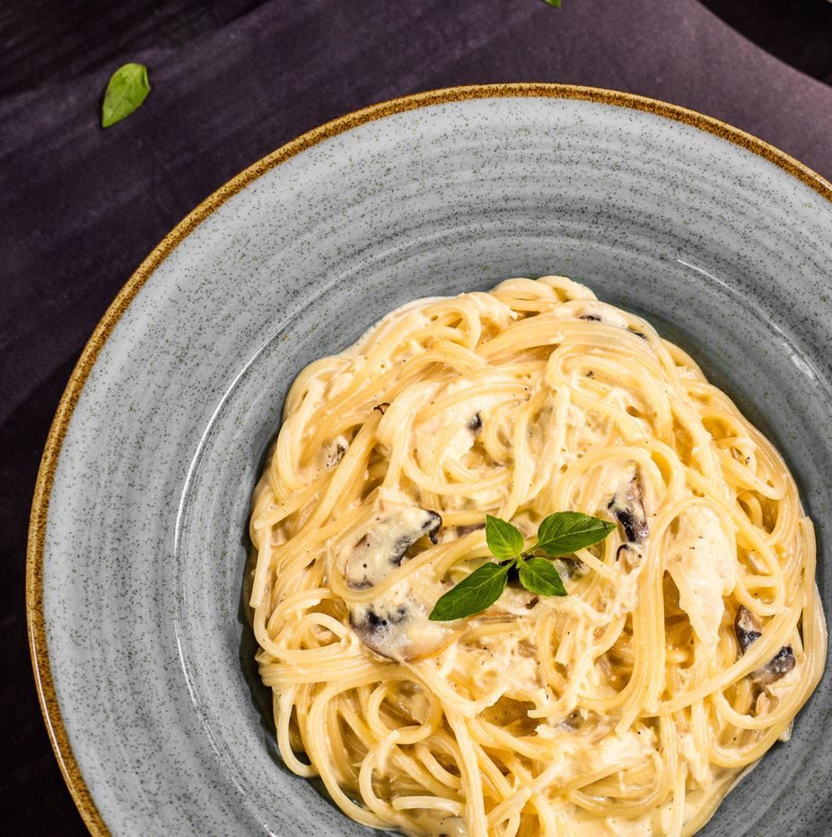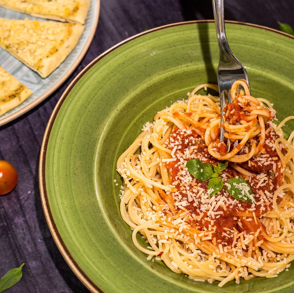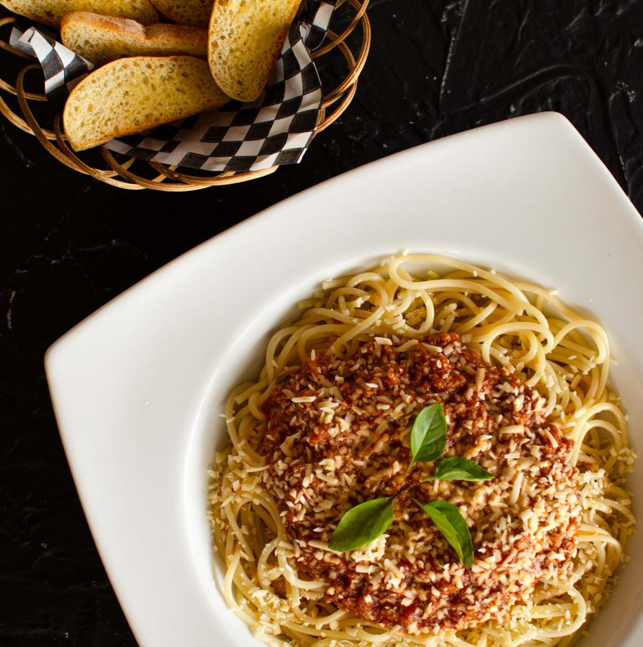 Pollo, champiñón y carne molida en salsa boloñesa tamaño 24 onz acompañada de rodajas de pan frances