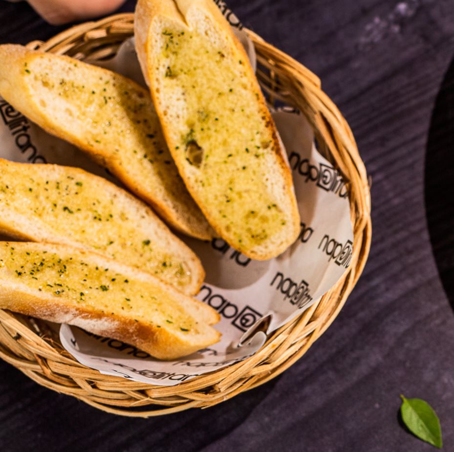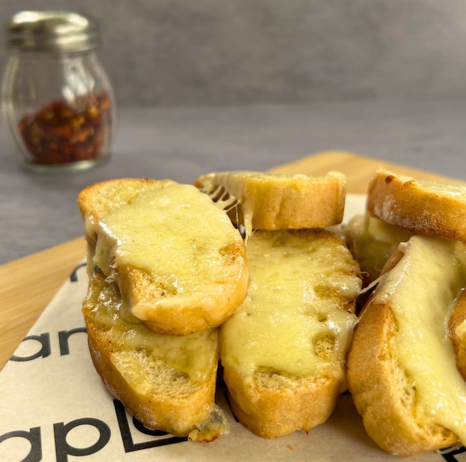 8 Rodajas de pan baguette artesanal con salsa de la casa y queso mozzarella.