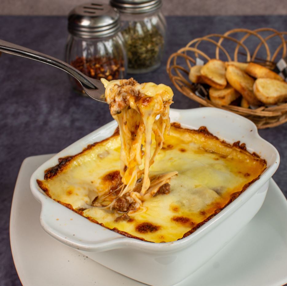 Lasaña con salsa boloñesa tamaño 24 onz acompañada de pan frances