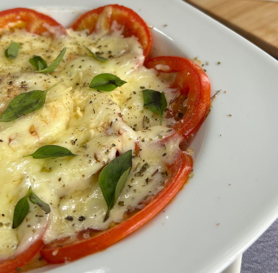 Rodajas de tomate maduro, con salsa pomodoro, queso mozzarella y decoradas con queso parmesano y albahaca fresca.