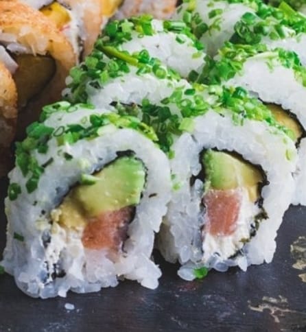 Salmón, aguacate y queso crema, envuelto en cebollín.