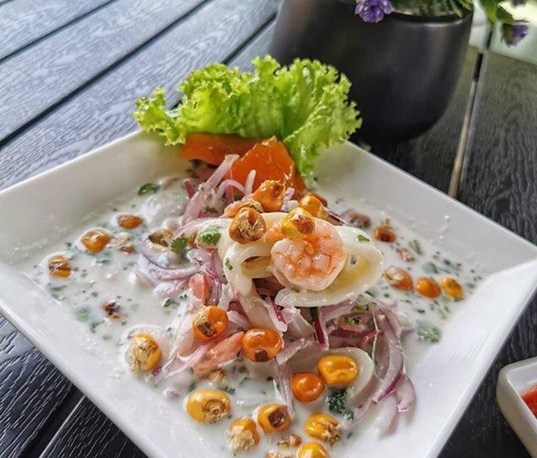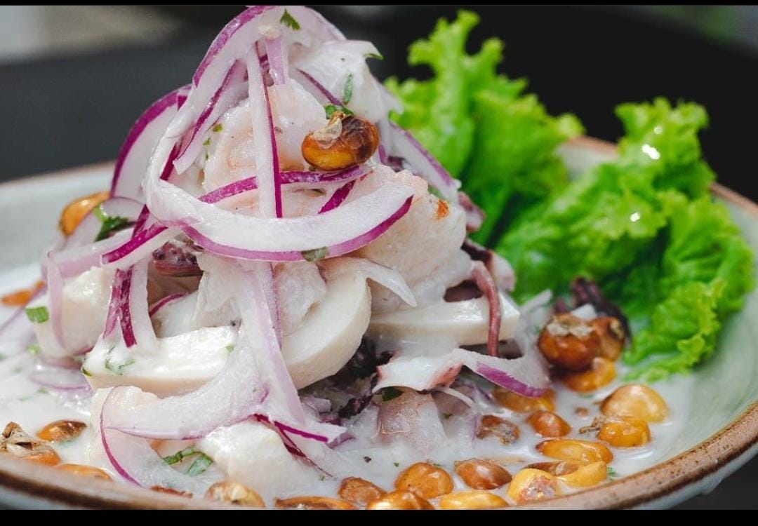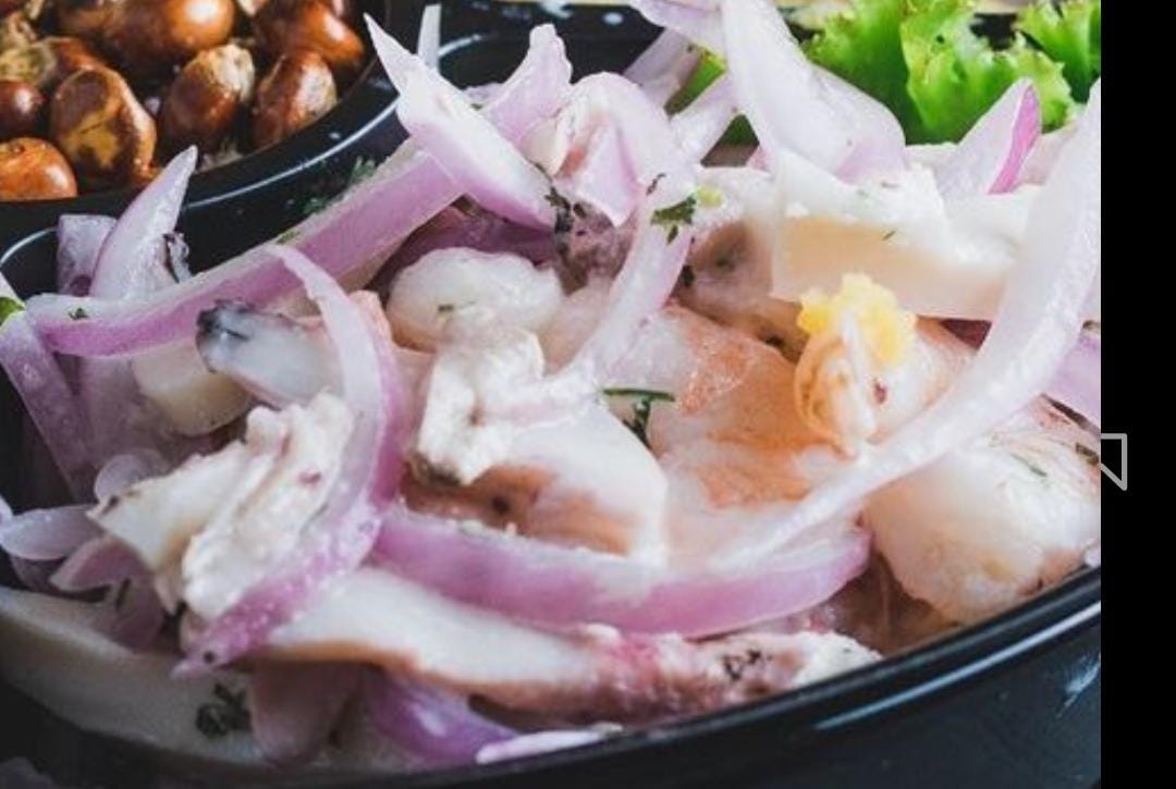 camarones y trozos pescados en leche tigre. Cebolla morada, camote, y cancha