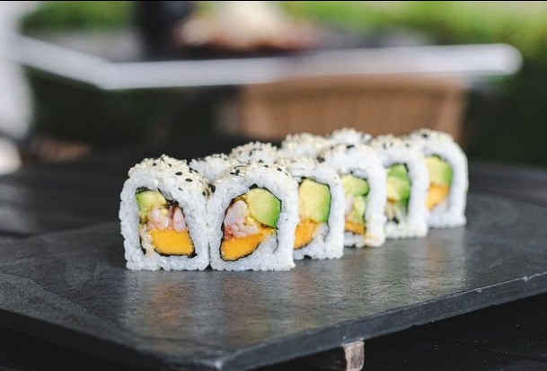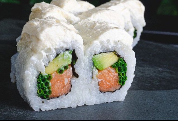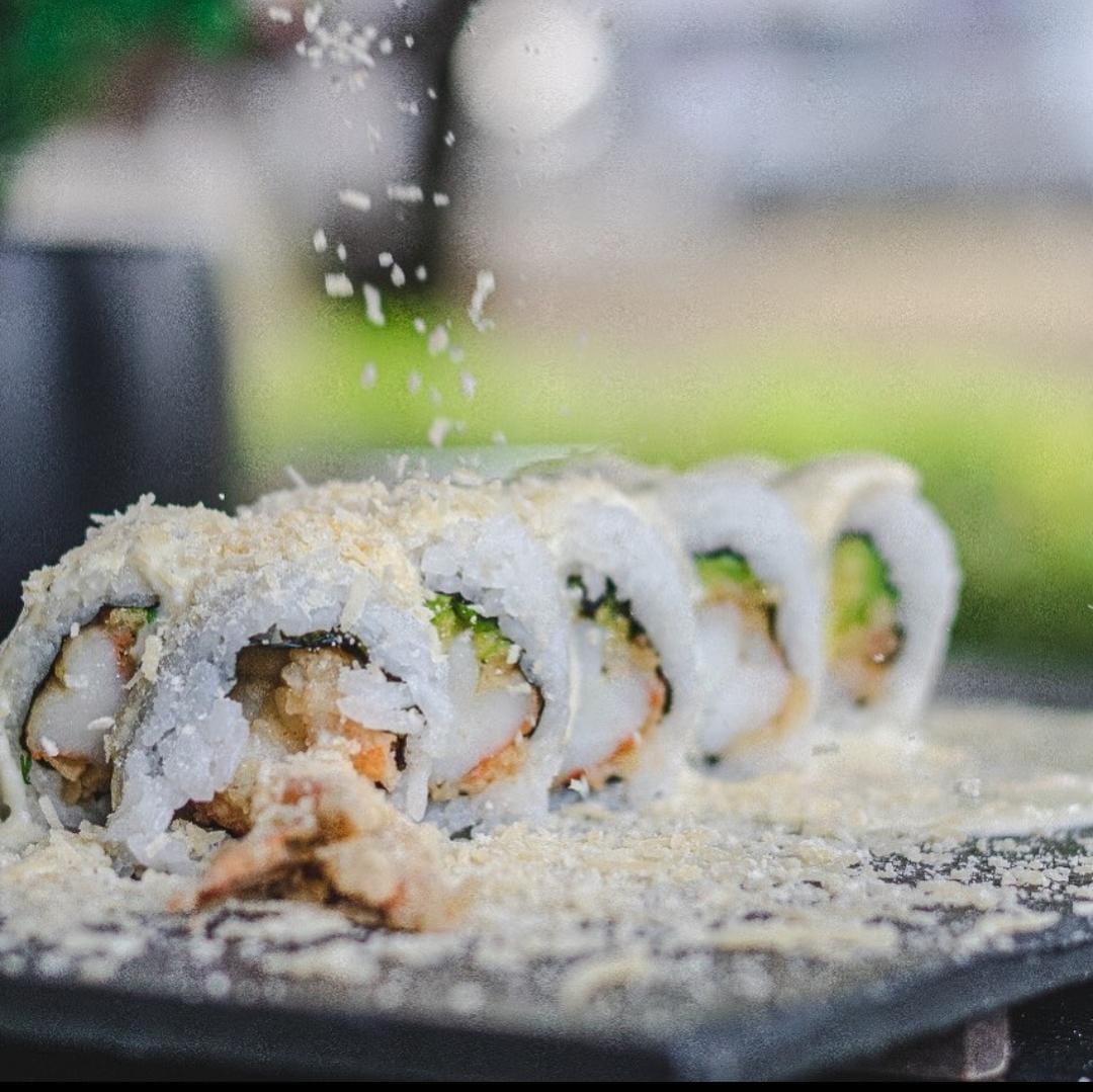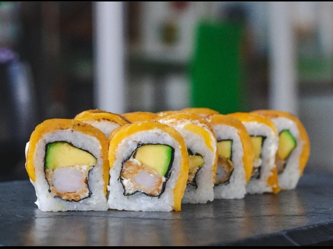 Camaron, aguacate y mango, envuelto en semillas de ajonjolí, cebollín o togarashi.