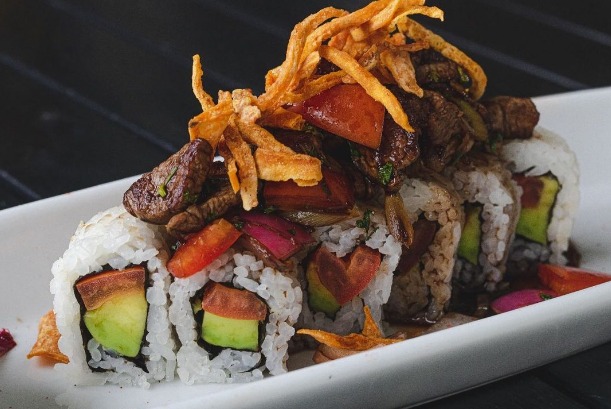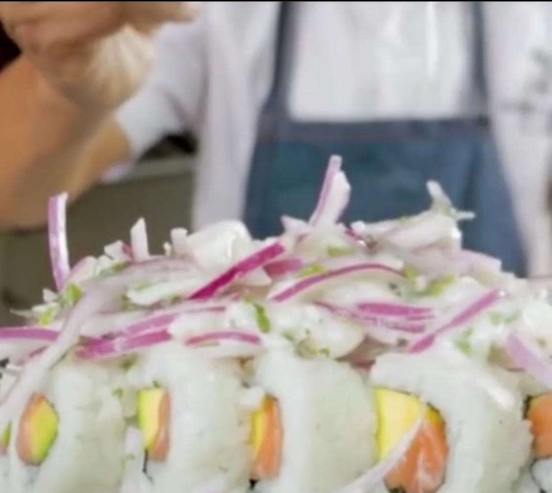 Relleno queso crema y aguacate coronado en lomo ceviche.