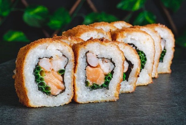 Camarón, aguacate y queso crema envuelto en salmón. Al panko