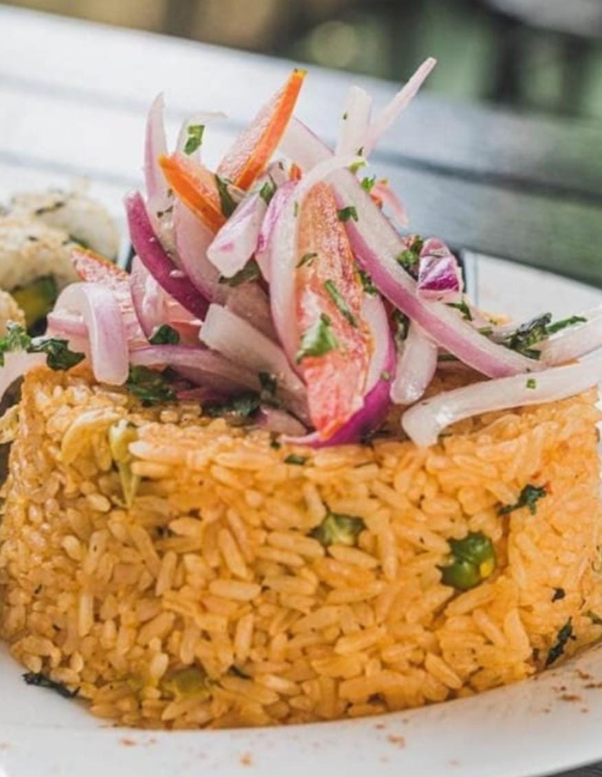 Salmón, aguacate, coronado con ceviche peruano.