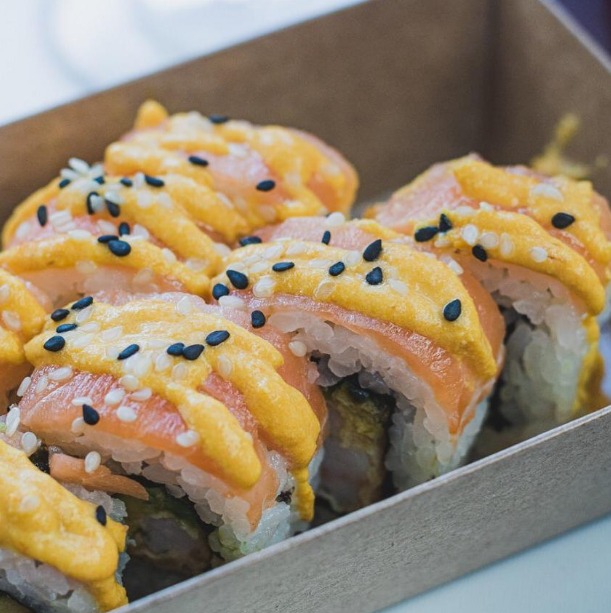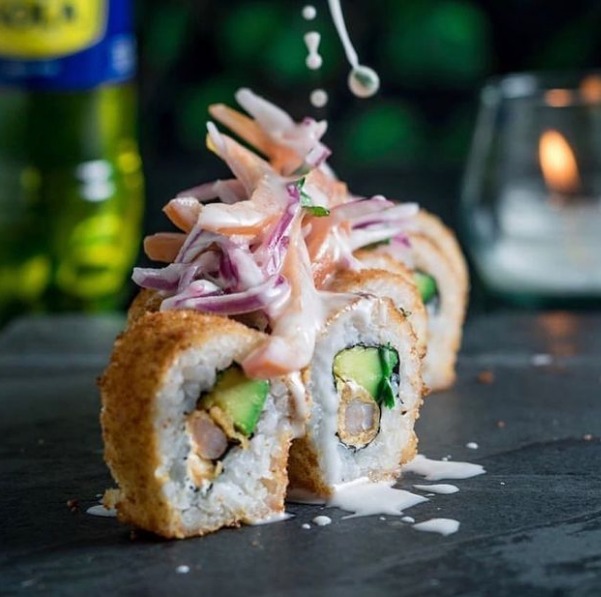 Camarón, aguacate, queso crema y cebobllín cubierto de salmón flámbeado.