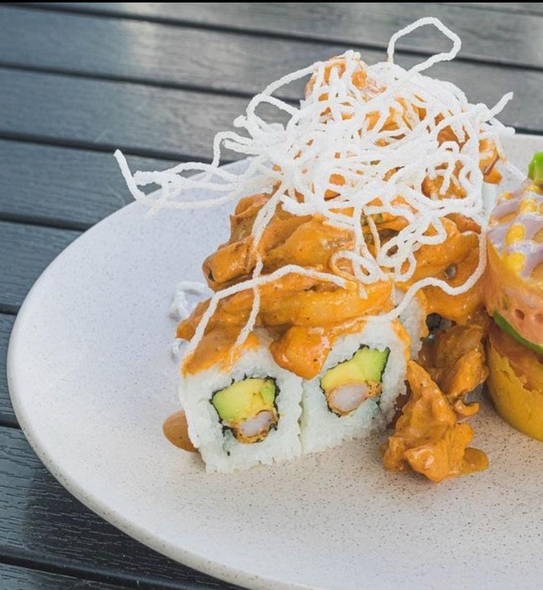 Camarón panko, aguacate y queso crema envuelto en maduro.