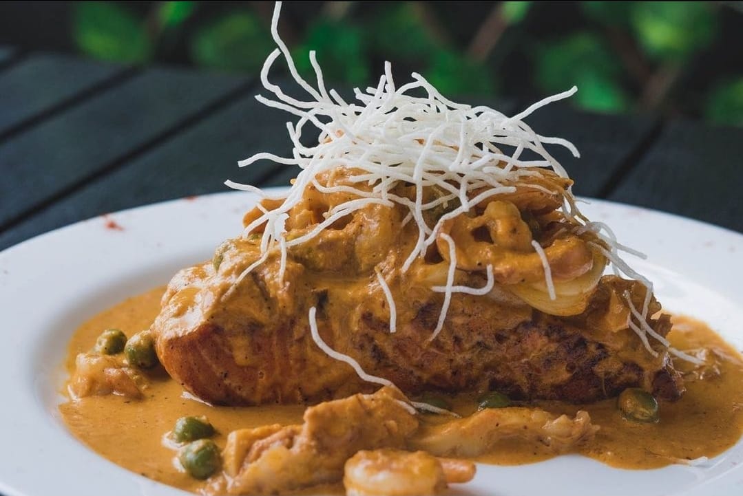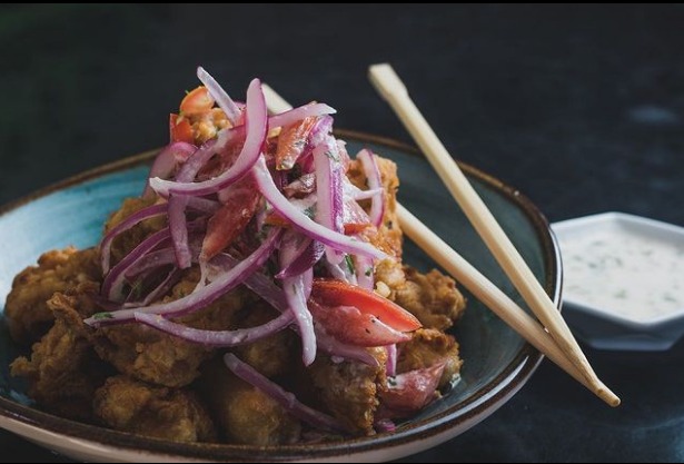 Langostinos apanado, aguacate, queso crema al panko y salsa criolla