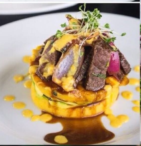 Trozos de lomo viche de res y camarón vegetales pimentón, , cebollín y tortillas de huevo