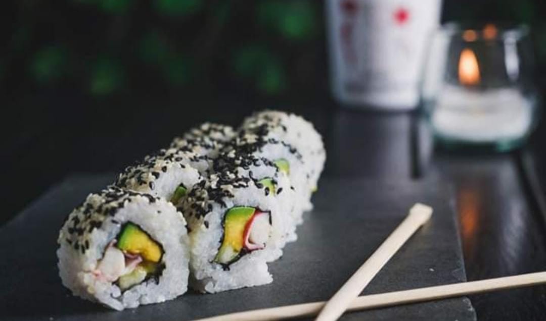 Palmitos de cangrejo, pepino y aguacate,envuelto en semillas de ajonjolí, cebollín o togarashi.
