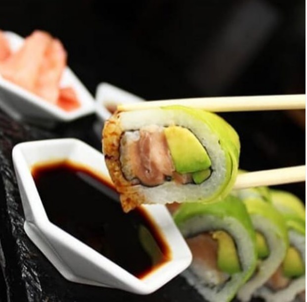 Pollo teriyaki, queso crema y aguacate,envuelto en semillas de ajonjolí, cebollín o togarashi.