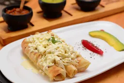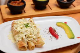 Orden de 3 unidades. Tortilla de maíz bañada en una salsa roja mexicana y rellenas de queso, acompañadas con una guarnición de aguacate.