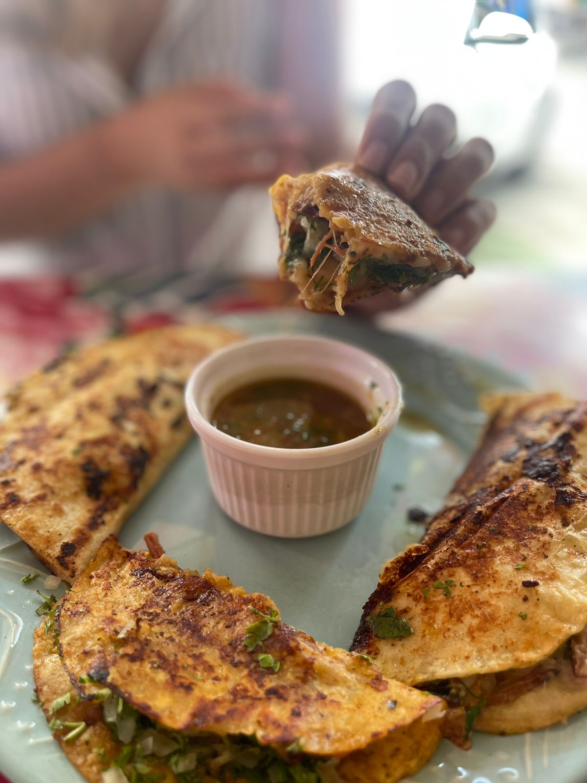 Tortilla de harina puesta a la plancha rellena de queso rayado. Pueden ser de suadero, pollo o pastor.