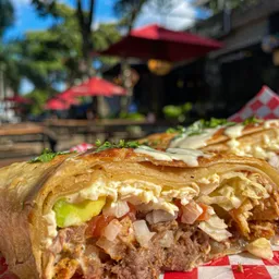 Tortilla de harina, con frijol refrito, aguacate tomate, lechuga, queso, sour cream y una porción de carne de pastor, suadero y pollo.