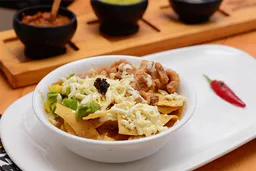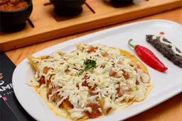 Base de totopos bañados en salsa roja, con proteína de preferencia, pastor, suadero o pollo, queso y crema. Acompañados de una guarnición de frijol refrito.