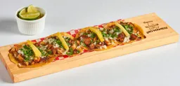 Tortilla de harina crocante con proteína de preferencia, al pastor, suadero o pollo, servida con lechuga, queso, crema y una guarnición de aguacate.