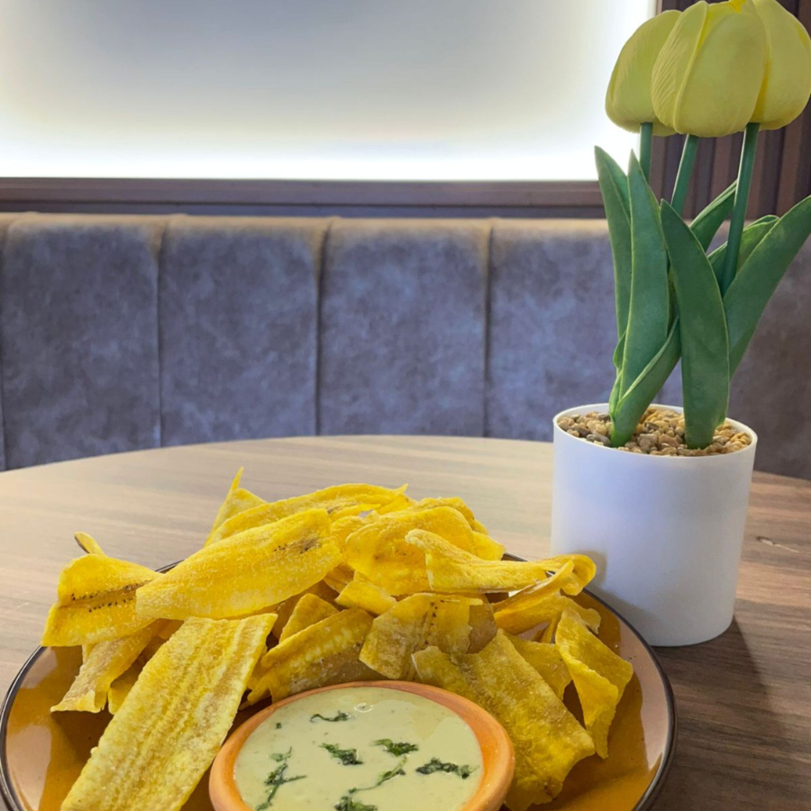 Una opción saludable y equilibrada con arroz de lentejas, pechuga de pollo, pepino fresco, ensalada, plátano maduro y crotones, energía y sabor en cada bocado. acompañado con salsa de la casa.