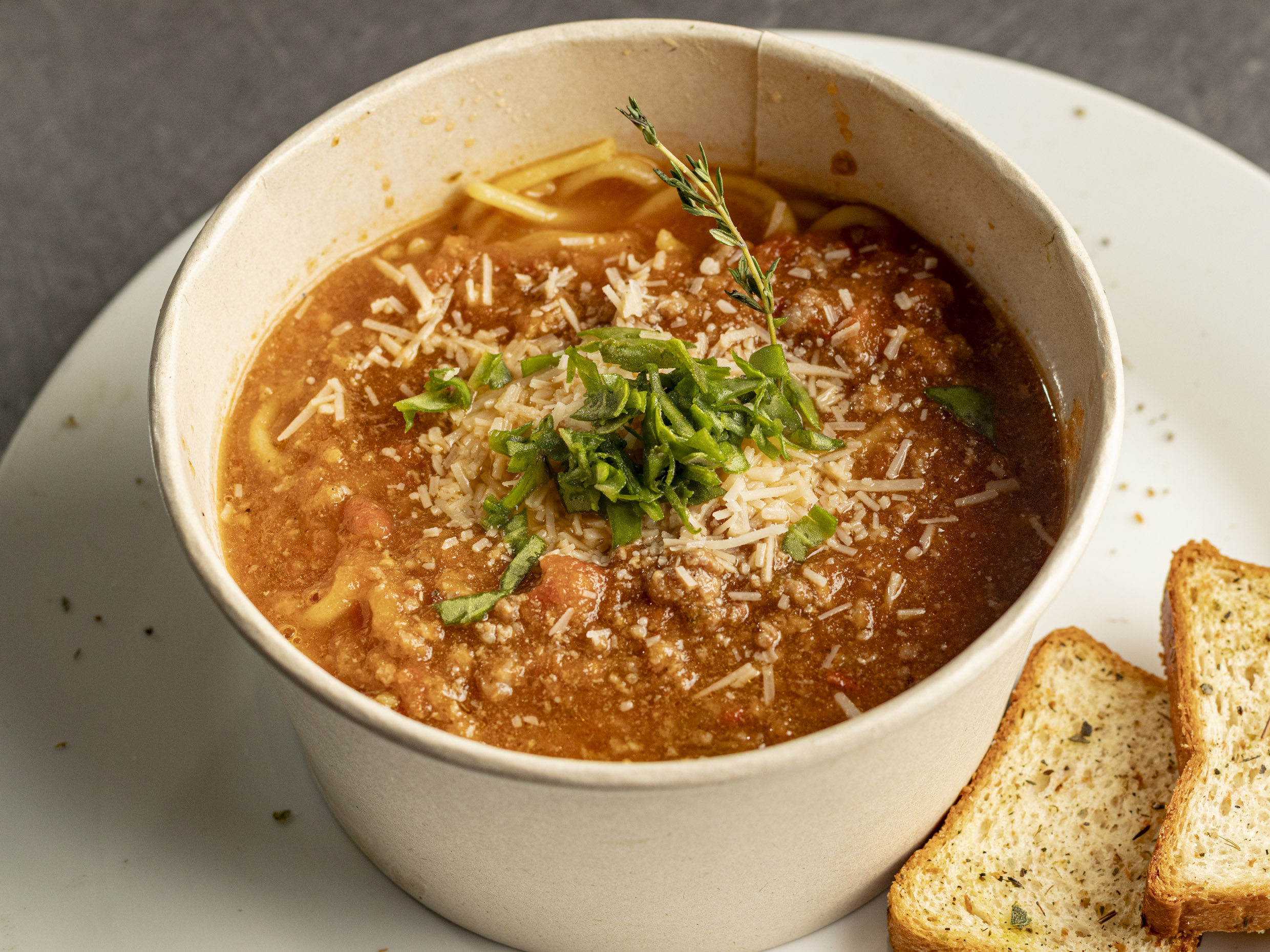 Deliciosos espaguetis aderezado en salsa napolitana, hiervas italianas, finalizada en carne de res triturada y toque de queso parmesano, acompañado de madurito o pan tostado en finas hierbas. (Porción personal)
