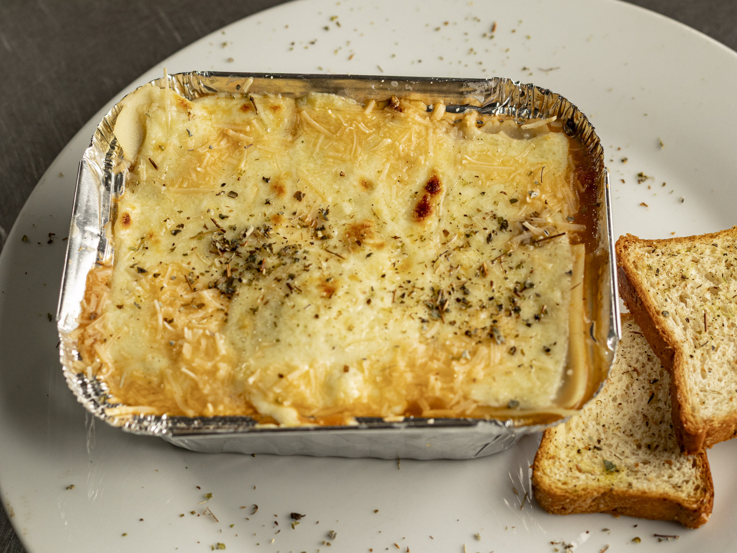 Espagueti con albahaca en salsa alfredo, cubiertos con queso mozzarella derretida, pollo a la parrilla, y condimento italiano, acompañado de pan tostados de finas hierbas.
