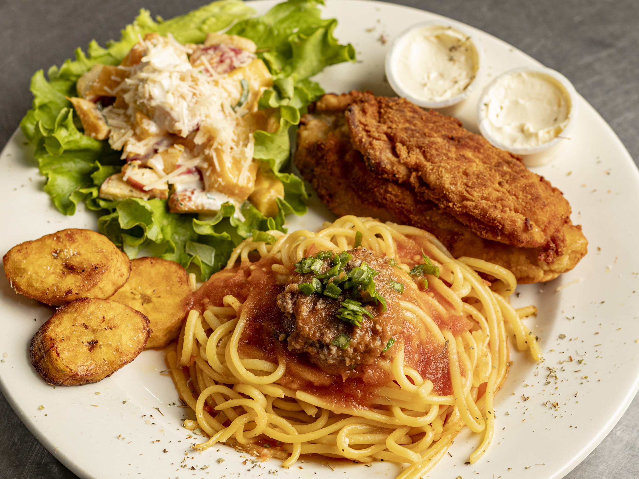 Pollo parmesano, espagueti aderezado en salsa napolitana y alfredo, con queso parmesano y mozzarella. Acompañado de pan tostado en finas hierbas.