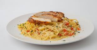 Espagueti en mezcla de crema de leche y tocineta ahumada, con toque de pimienta negra tostada y vino blanco al final filete de pollo a la parrilla acompañado de pan tostado en finas hierbas.