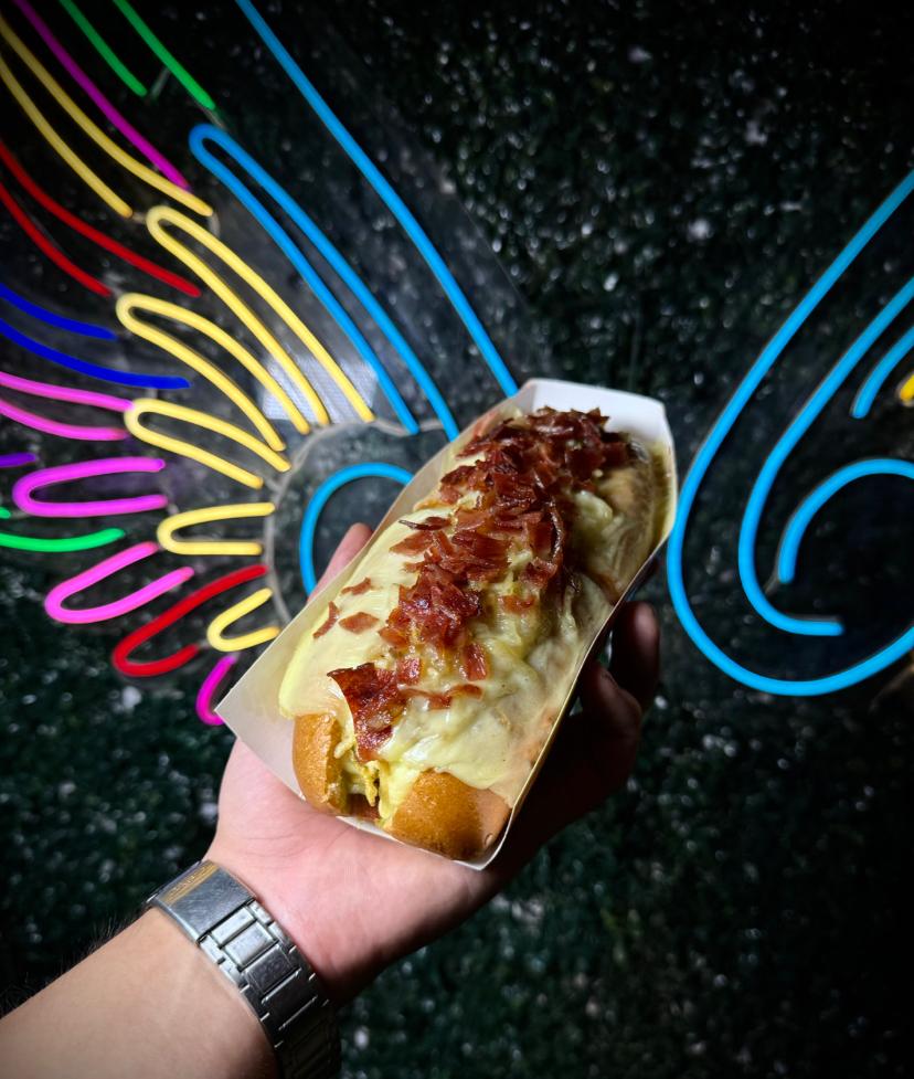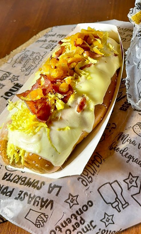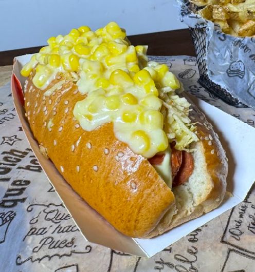 Salchicha americana, pan brioche, tocineta, pollo desmechado, queso fundido con maicitos, ripio de papa, piña calada, crema de cebolla, salsa de la casa.