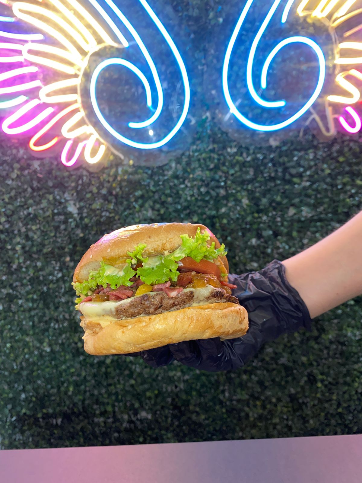 Pan brioche, carne angus, tocineta, queso mozzarella, queso cheddar, ripio de papa, piña calada, tomate, lechuga, cebolla, salsa de la casa.