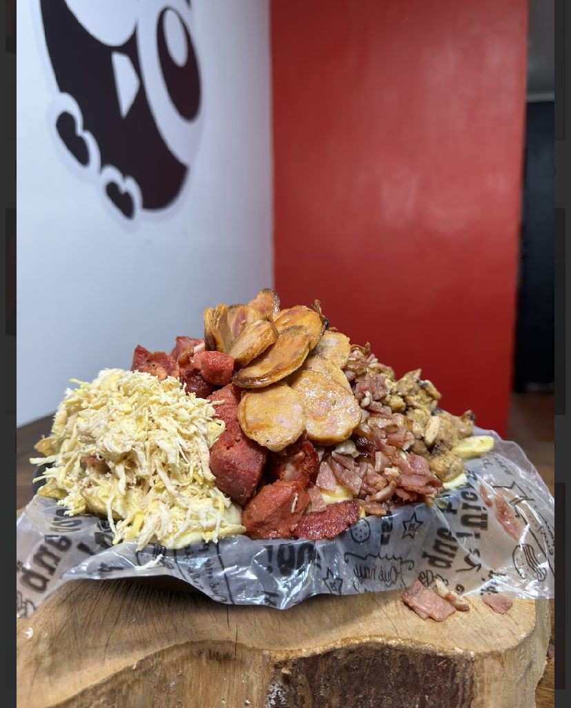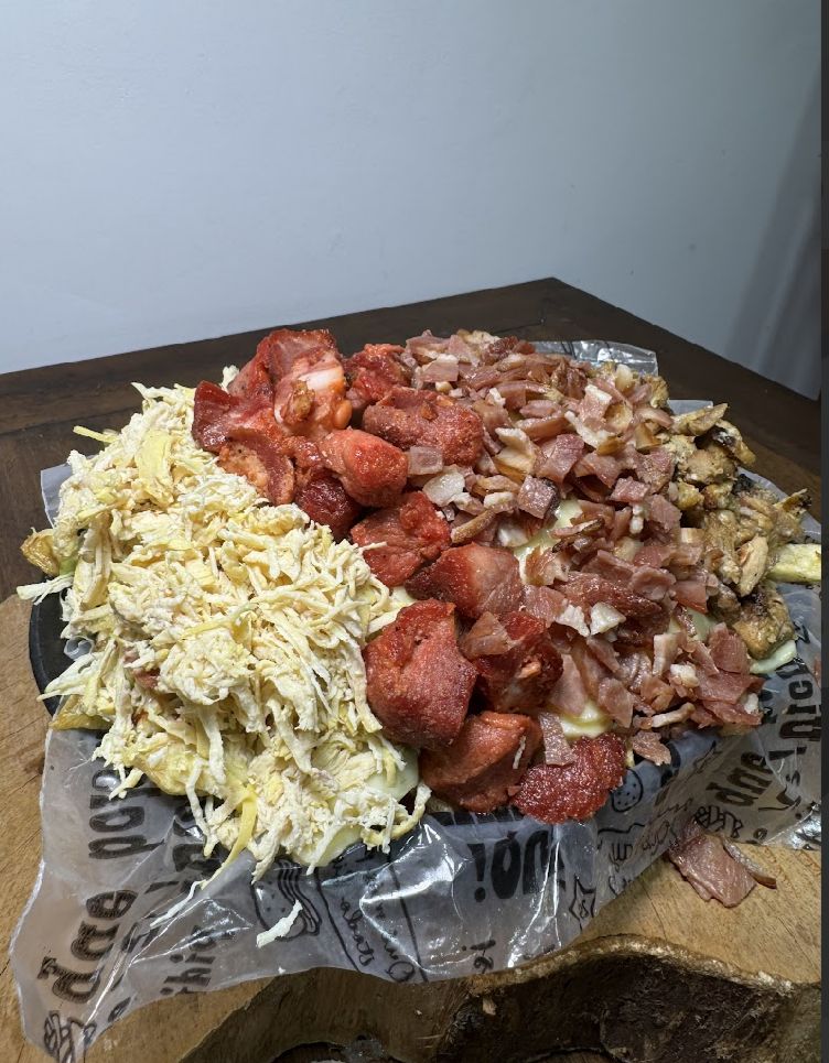 Aprox. 200 g de papas a la francesa con 100 g de salchicha premium, queso mozzarella, trozos de cerdo (45 g), pollo desmechado (45 g), costilla (45 g), tocineta (45 g), ripio de papa y salsa de la casa. (Porción personal)