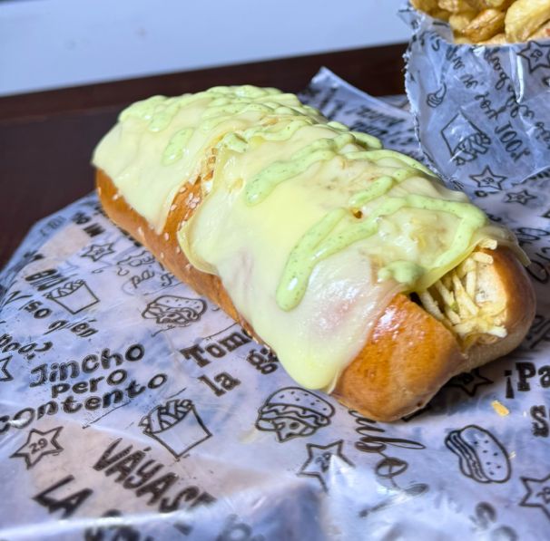 Salchicha americana, pan brioche, queso mozzarella, ripio de papa, crema de cebolla, salsa de la casa.