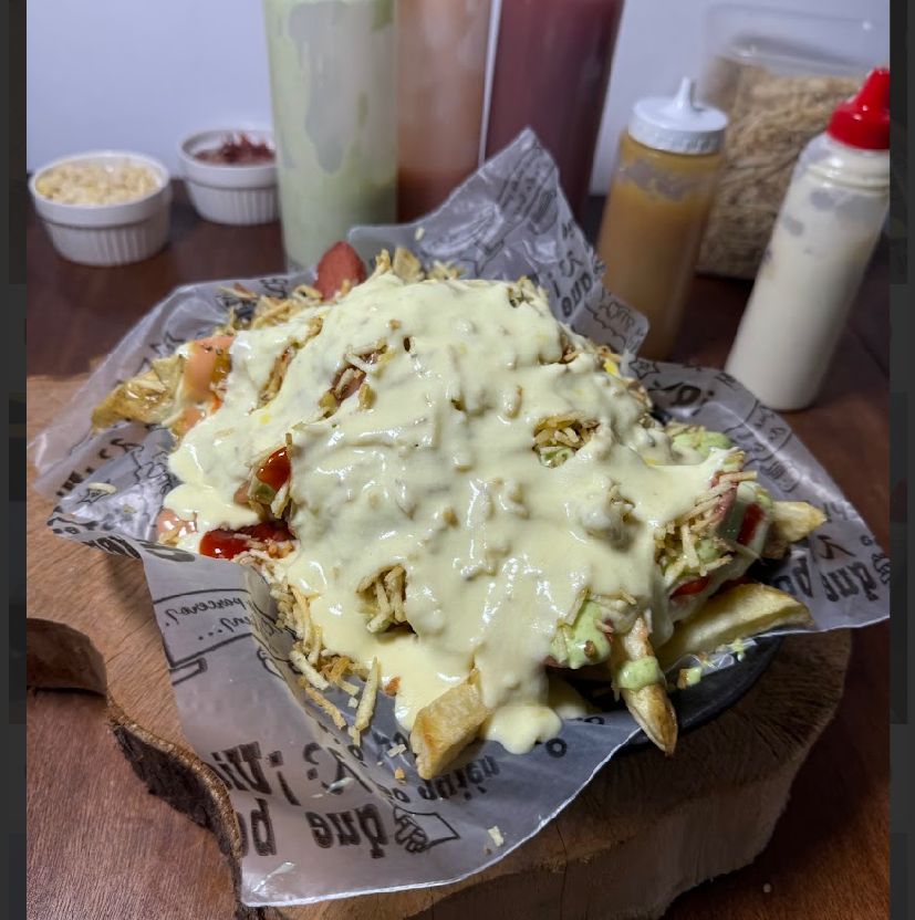 Papas a la francesa, salchicha premium, queso mozzarella, trozos de cerdo, pollo desmechado, ripio de papa, salsa de la casa.