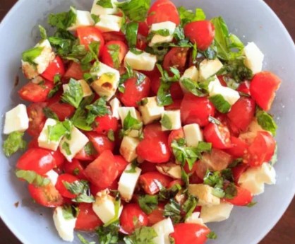 Rodajas de tomate fresco, albahaca, queso mozzarella y salsa de la casa.