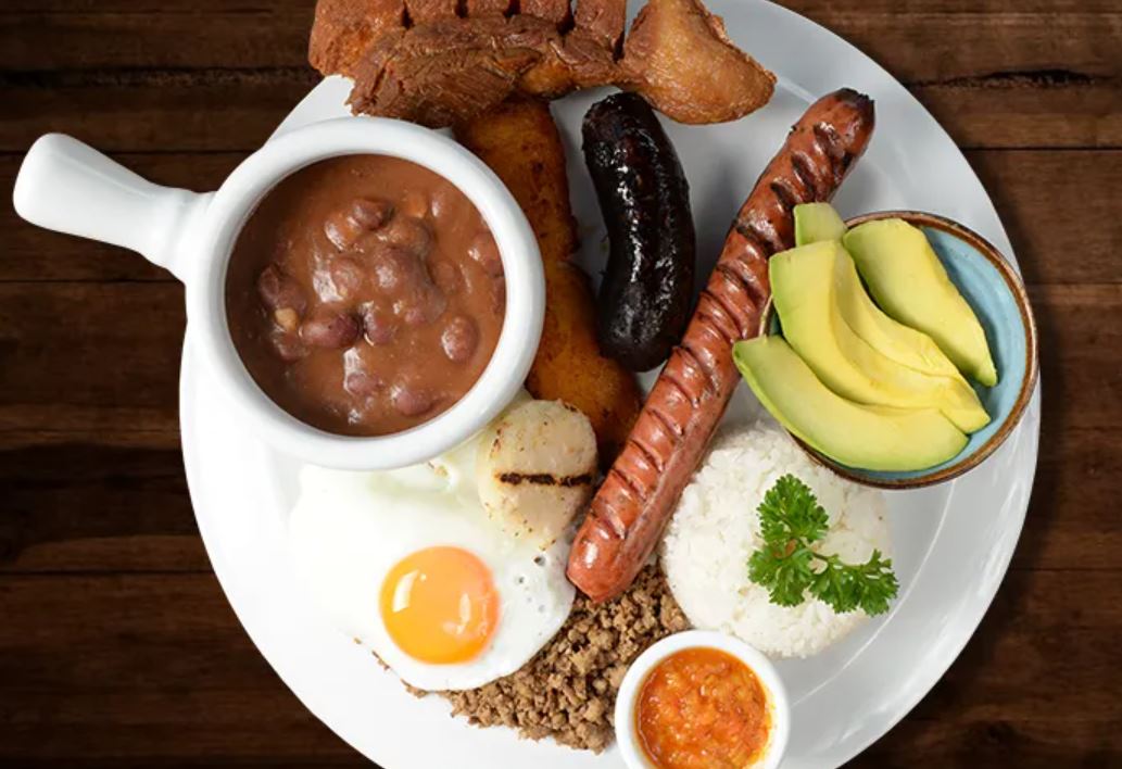 Bandeja con frijol, arroz, carne molida, chorizo, chicharrón, huevo frito, maduro, aguacate, tamaño y bebida a elección. (Paisa en menor Tamaño)