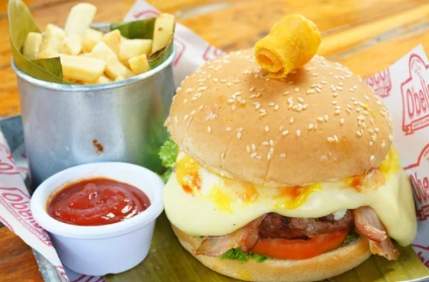 Hamburguesa de res a la parrilla, queso mozzarella, tocineta, cebolla, tomate, lechuga y papas a eleccion.