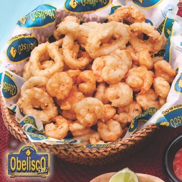 Langostinos, calamares y camarones apanados, moneditas de platano y acompanante a eleccion. 2 pers.