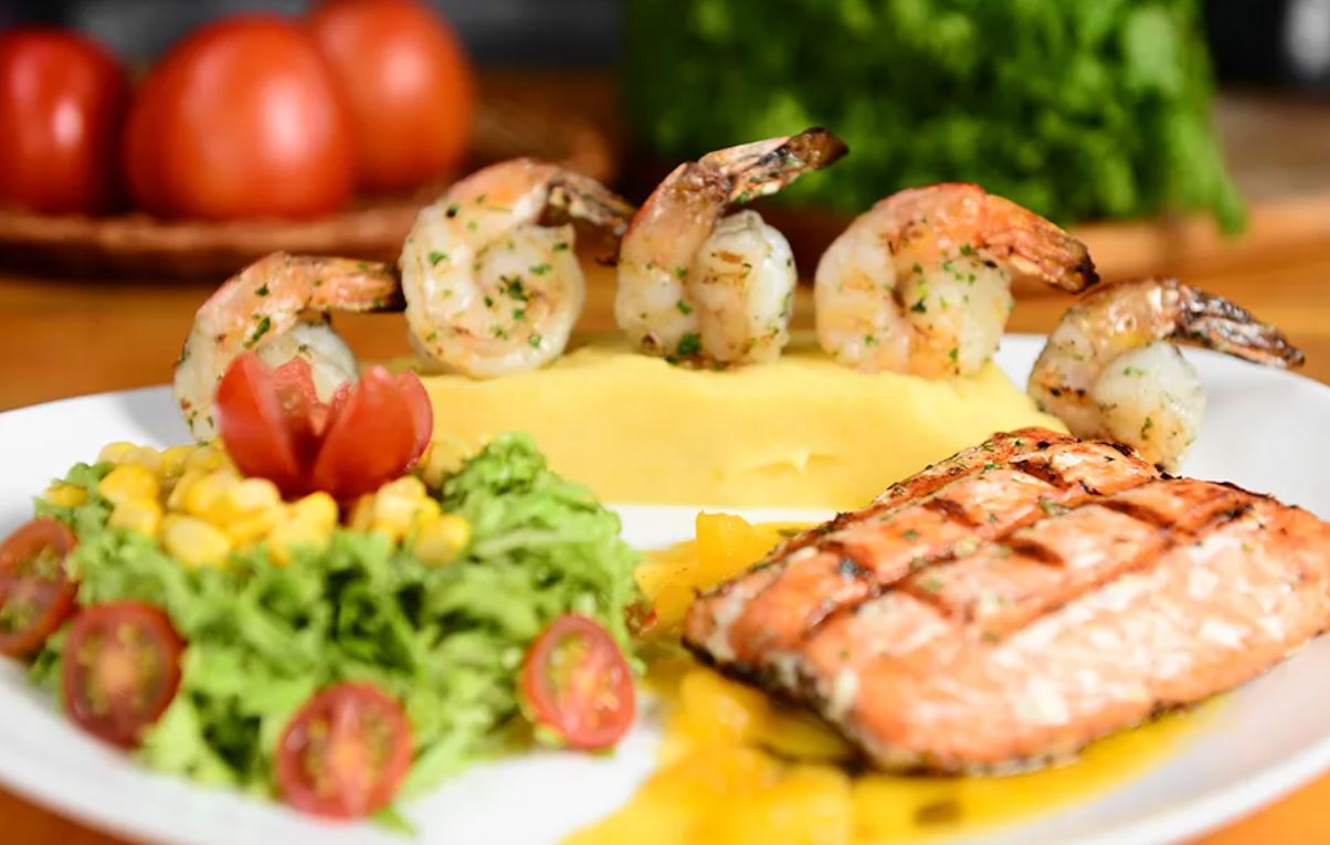 Salmón y langostinos a la parrilla, puré y ensalada de la casa.