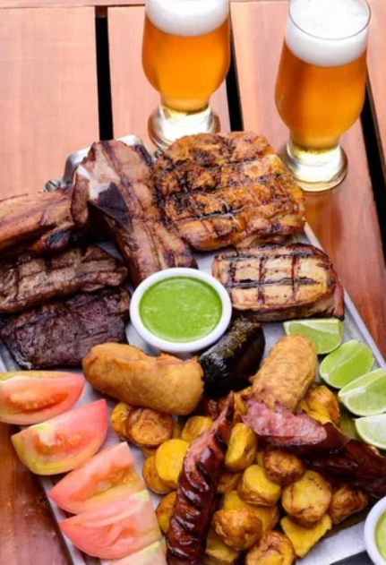 Parrillada con lomito x2, baby ribs x2, minon de cerdo x1, aborrajados x2, chorizo, morcilla, pernil pollo, papa criolla, salsas 3 bebidas a eleccion.