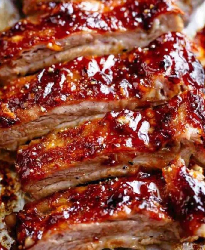 Costilla al horno trocitos en salsa BBQ con moneditas de plátano de tamaño a elección.