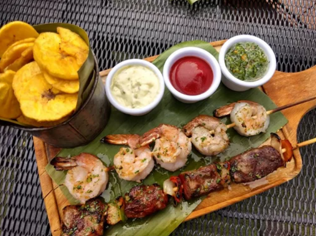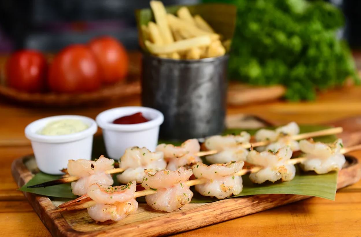 Pincho de res con brocheta de langostinos y acompanante a eleccion.