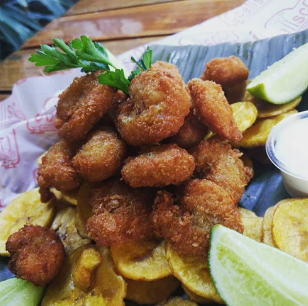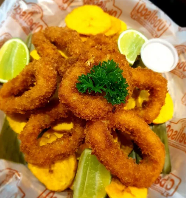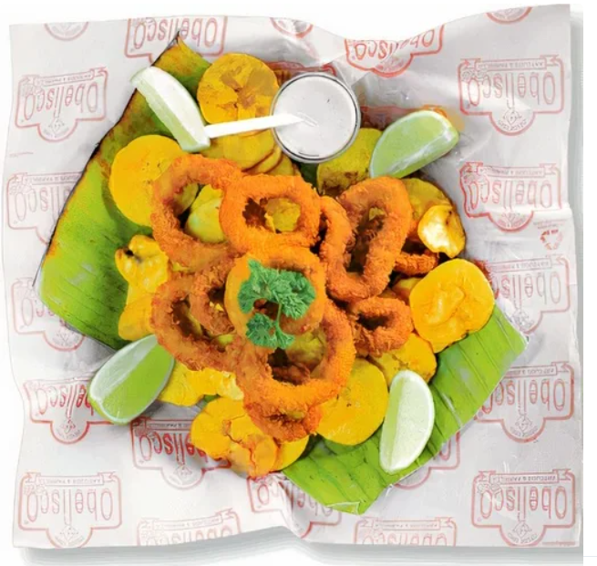 Camarones y calamares apanados, moneditas de platano y salsa tartara.