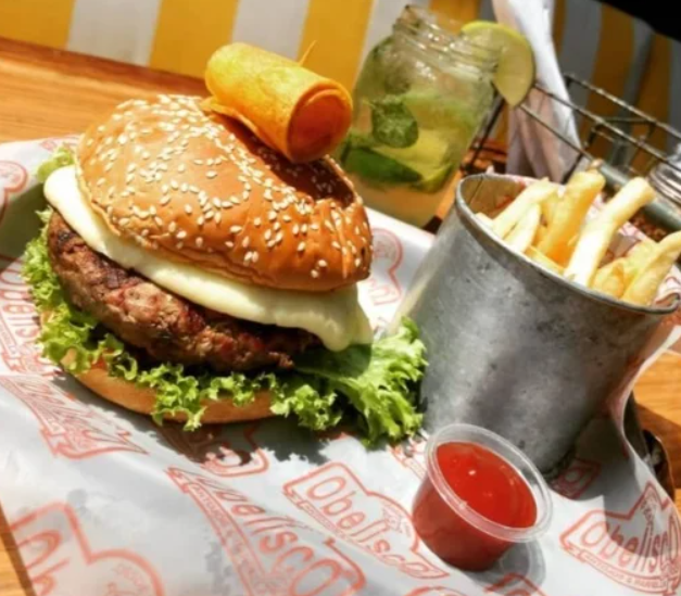 Hamburguesa de res a la parrilla, cebolla, tomate, lechuga y papas a eleccion.