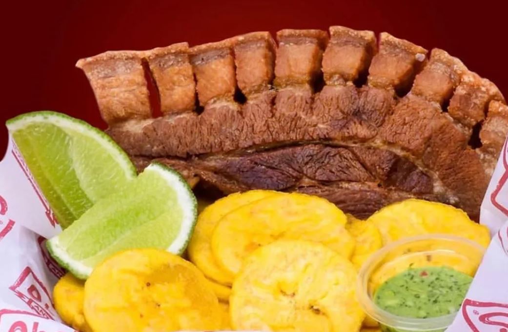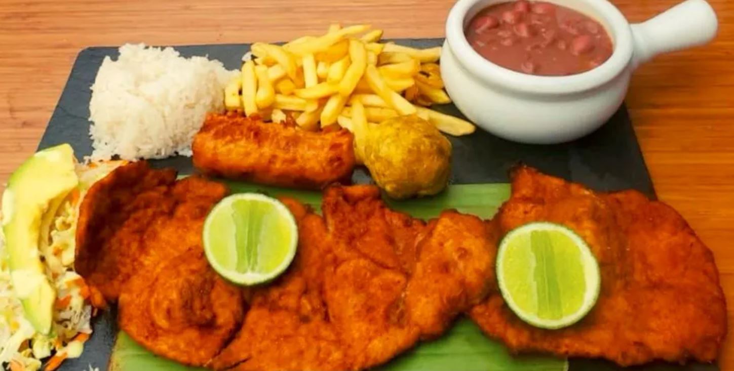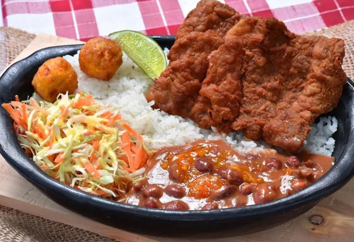Chuleta valluna con frijoles, aborrajado, marranita, papas, arroz, ensalada con aguacate y bebida a elección.