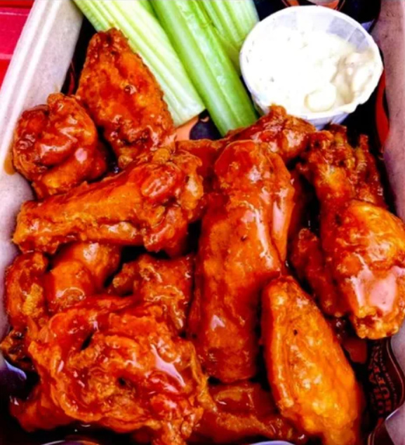 Alitas de pollo, apio, zanahoria, salsa de queso azul, cantidad y salsa a eleccion