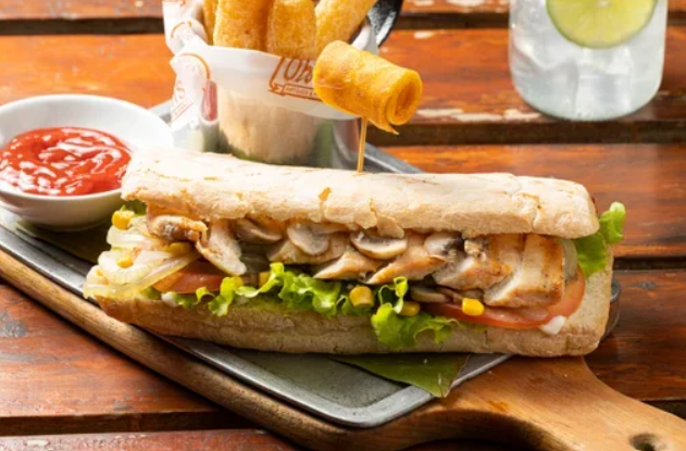 Sandwich de lomo viche, tomate, lechuga, cebolla grille, salsa de champinones y acompanante a eleccion.