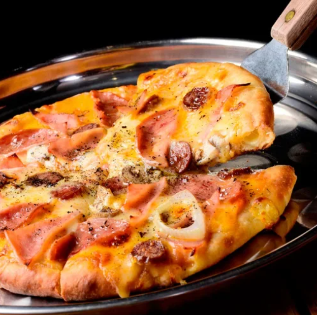 Pizza con jamón, salami, cabanos, champiñones, queso mozzarella, cebolla y salsa de la casa.